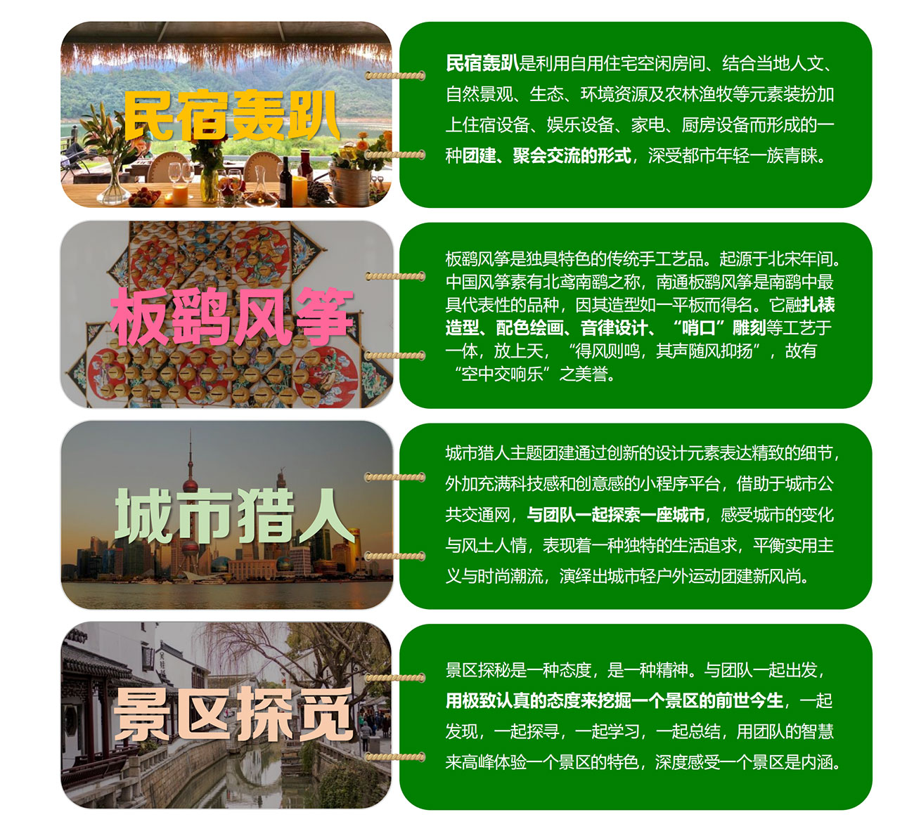 文旅團建,跨地域探索自然、人文、景觀,設(shè)計系列主題活動。例如:利用自用住宅空閑房間、結(jié)合當(dāng)?shù)厝宋摹?自然景觀、生態(tài)、環(huán)境資源及農(nóng)林漁牧等元素裝扮加上住宿設(shè)備,打造一個慢生活的減壓團建形式。